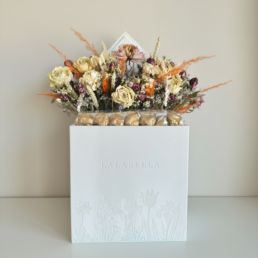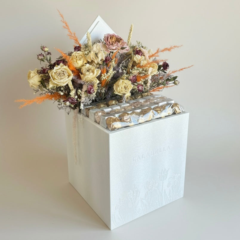 A luxury leather box containing 22 assorted pieces of the finest Belgian chocolate, adorned with dried flowers, carefully selected to offer an exceptional tasting experience