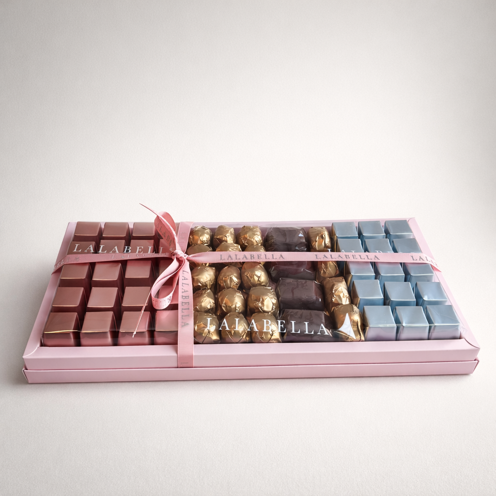 A curated assortment of Mia chocolates, Nai, Almond Ball, and croquant Praline Hazelnut  presented in gift sets available in pink, green, purple, white, and charcoal with matching wrappings. Each collection includes making it a stylish choice for gifting or personal indulgence