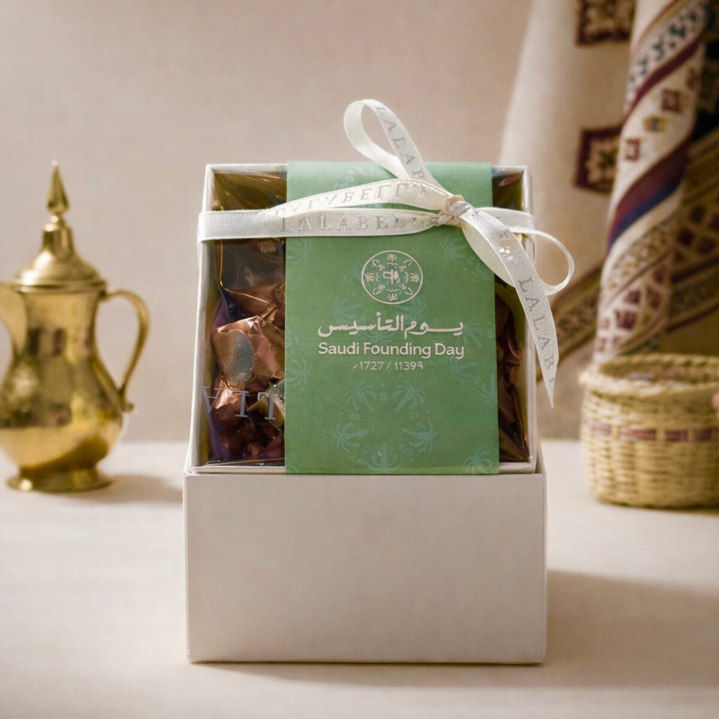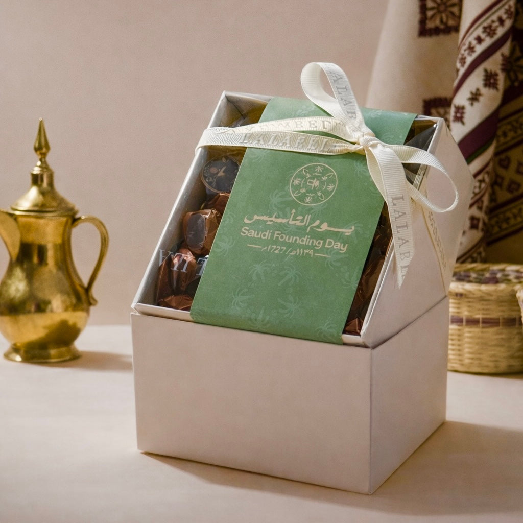 A soft, elegant box filled with 250g Mixed of Rocher chocolates, beautifully arranged. Finished with a Saudi Founding Day sleeve .