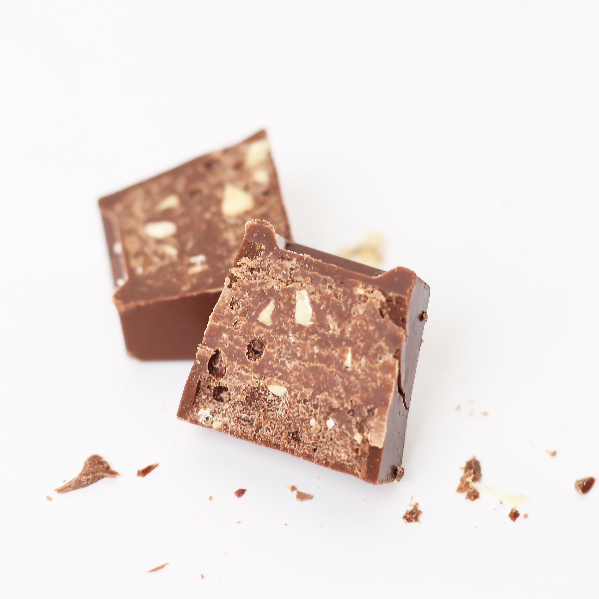 Chocolate cube stuffed with crushed pistachio in green wrapping.