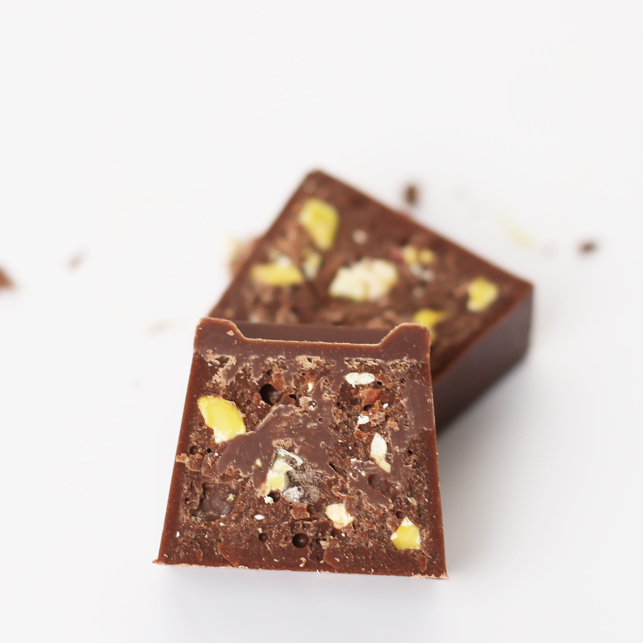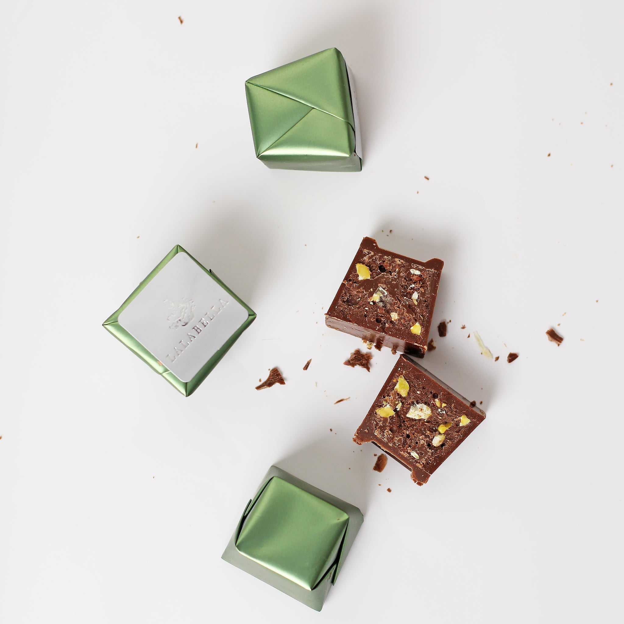 Chocolate cube stuffed with crushed pistachio in green wrapping.
