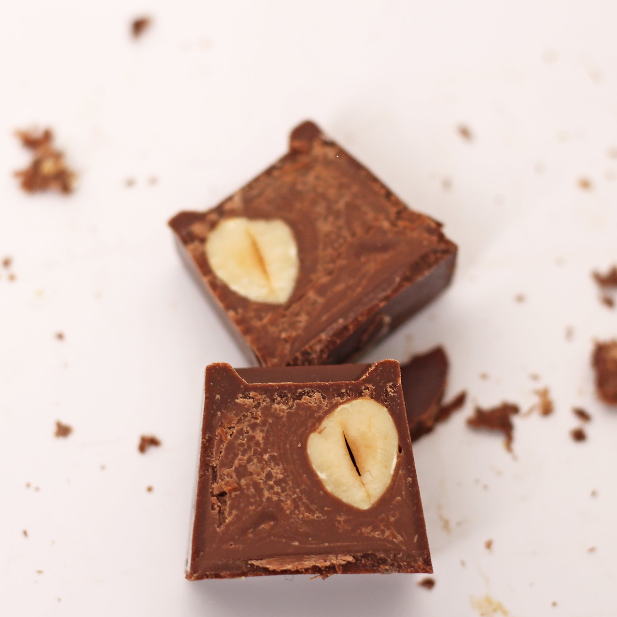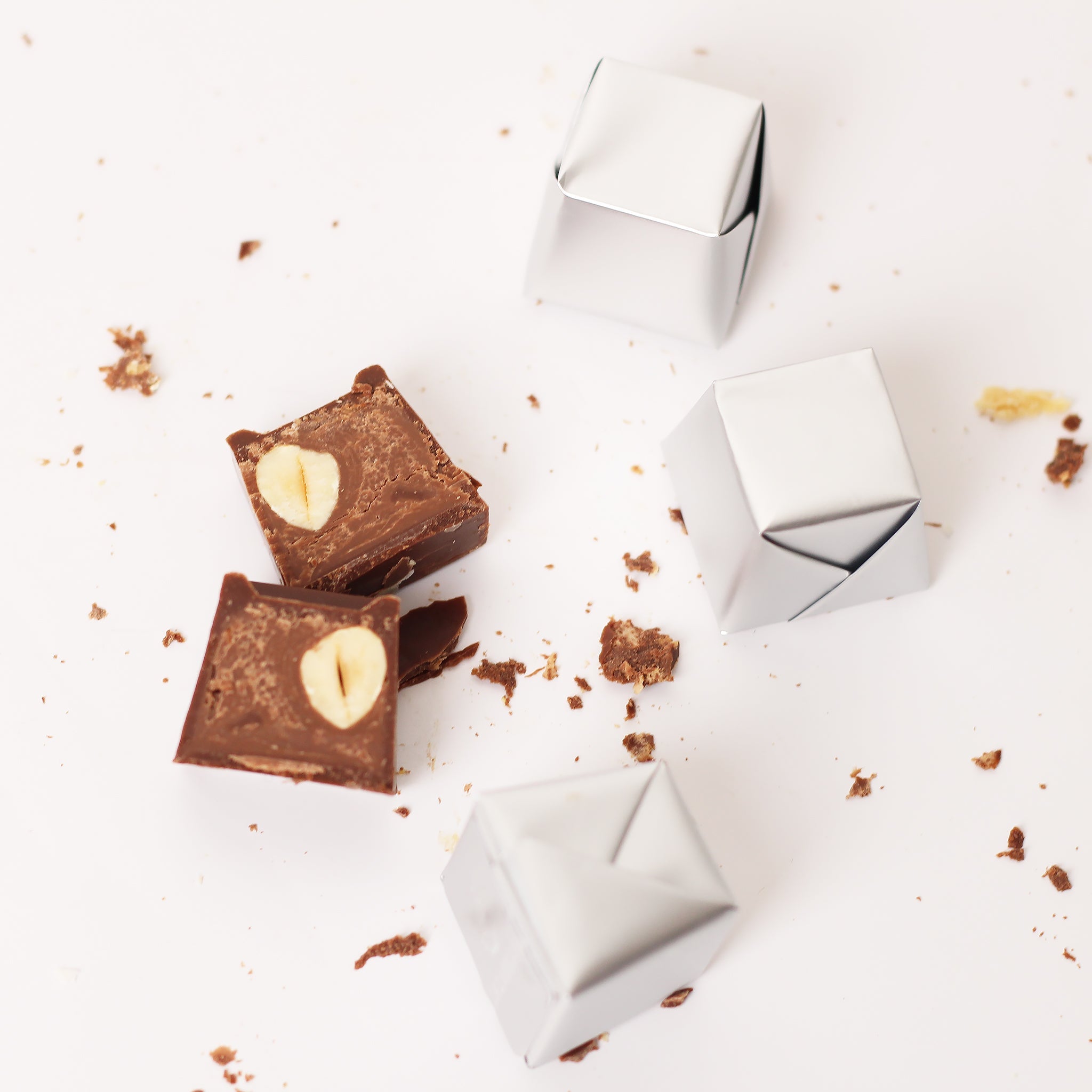 Chocolate cube stuffed with whole hazelnut and hazelnut cream in silver wrapping.