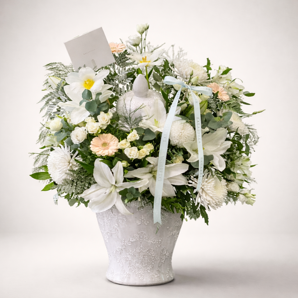 تنسيق زهور رائع يضم الزنابق البيضاء الأنيقة والأقحوان والورود والأزهار الموسمية الرقيقة، منسقة بشكل جميل مع خضرة طازجة في مزهرية مزخرفة. يخلق هذا التصميم مظهرًا ناعمًا وجديدًا ومتطورًا، مثاليًا للإهداء أو إضافة لمسة من الأناقة إلى أي مساحة.