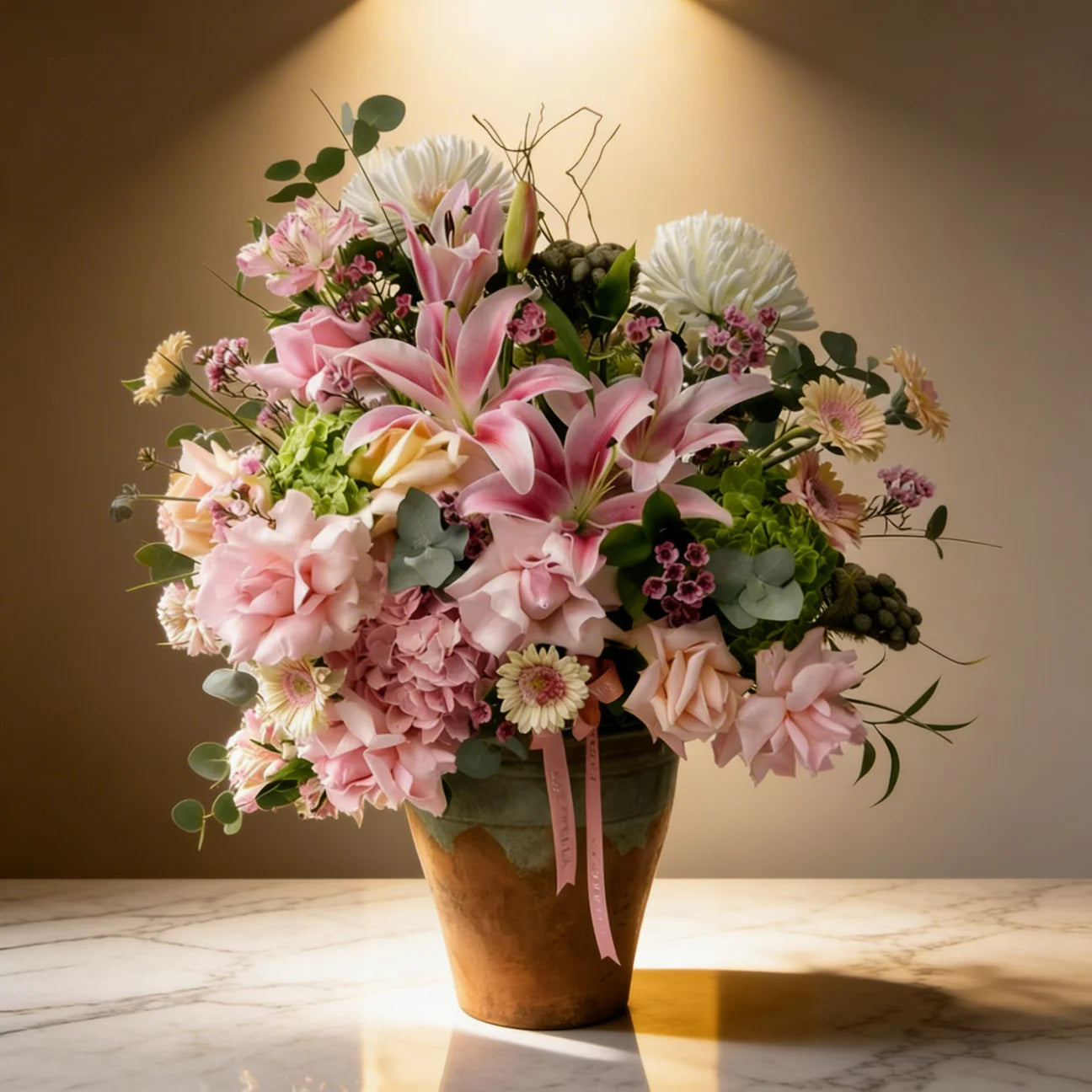 تنسيق زهور أنيق يضم الزنابق الوردية الناعمة والورود والكوبية والأزهار الموسمية، تم ترتيبها بشكل جميل في مزهرية لإضفاء مظهر منعش وساحر على طراز الحديقة. مثالية للإهداء أو إضافة لمسة من الجمال إلى أي مساحة.