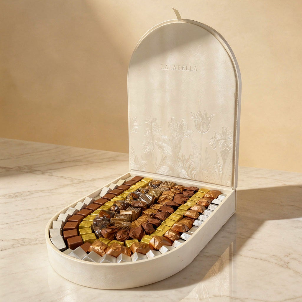 A statement Eid gift presented in a refined half-arch floral tray, filled with 1.660 g of premium seasonal chocolates. Designed as a luxurious centerpiece, this elegant selection combines artistic presentation with generous indulgence—perfect for sophisticated Eid gifting and gatherings.