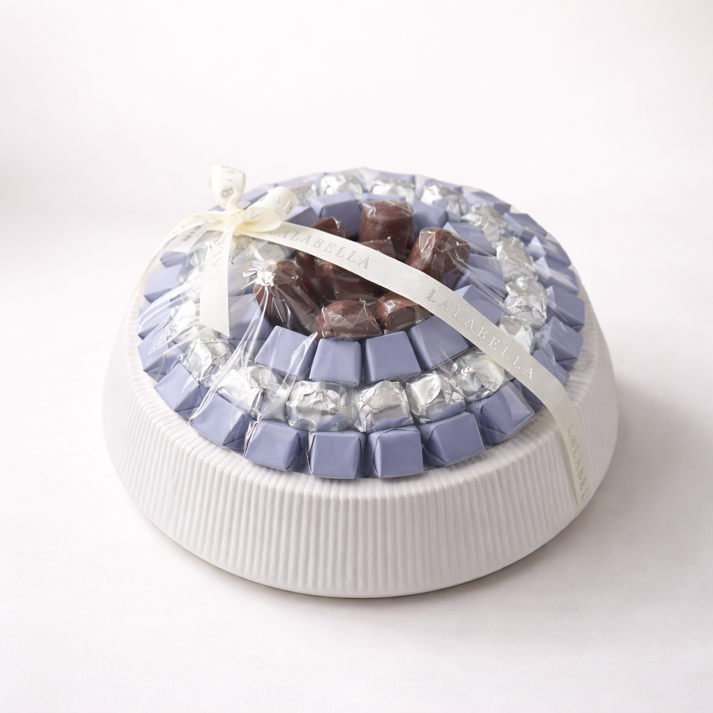 An elegant round chocolate arrangement presented in a textured white ceramic base, beautifully layered with premium chocolates in soft lavender and silver tones, finished with a delicate branded ribbon.