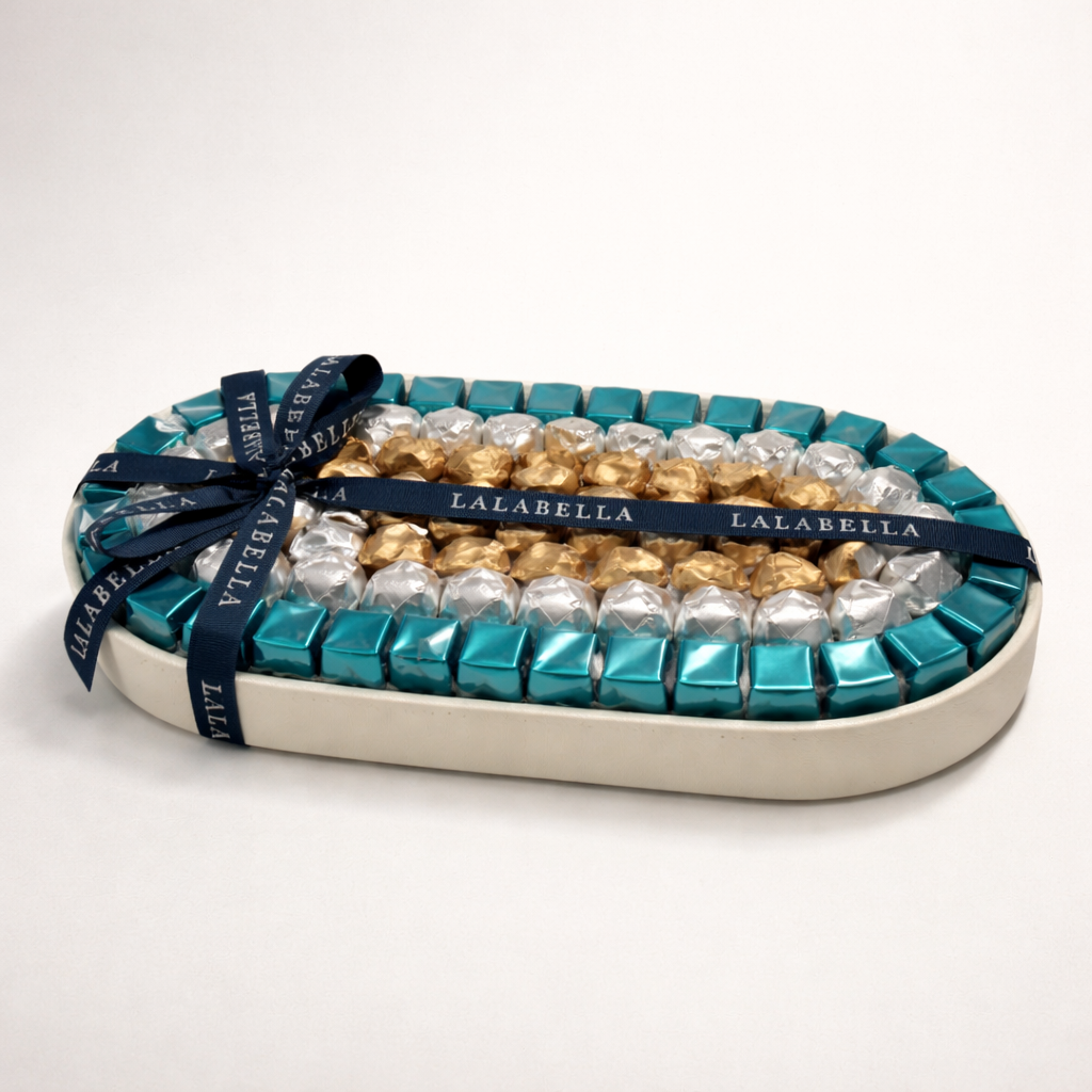 An elegant oval leather tray filled with a luxurious assortment of premium chocolates in rich emerald, silver, and gold tones. Beautifully arranged and finished with a signature ribbon, this refined piece is perfect for upscale gifting and special occasions.