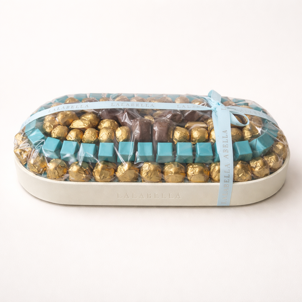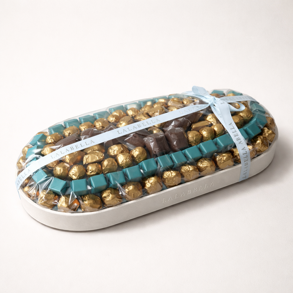 A luxurious oval leather tray, filled with 1872 g of premium assorted chocolates, elegantly arranged in refined gold and turquoise tones. A perfect choice for sophisticated gifting and special occasions with an unforgettable touch of luxury.