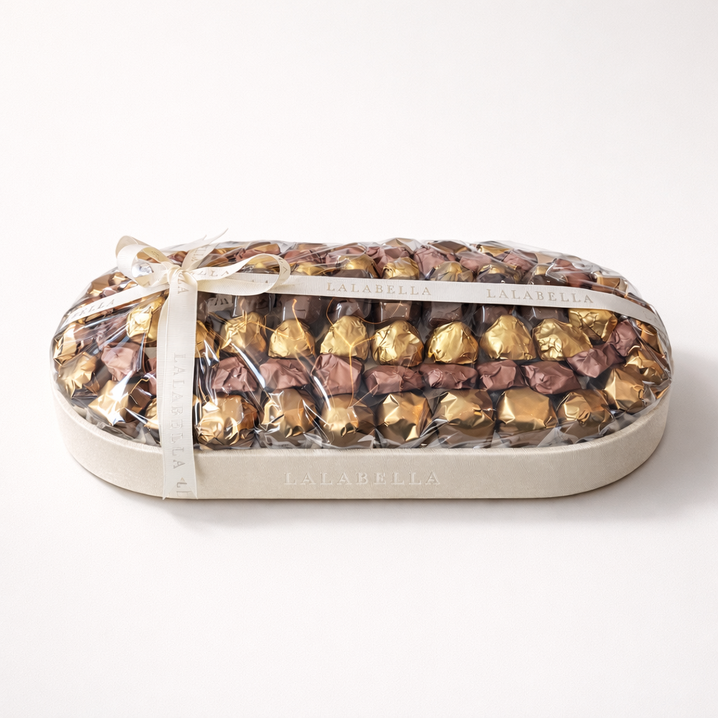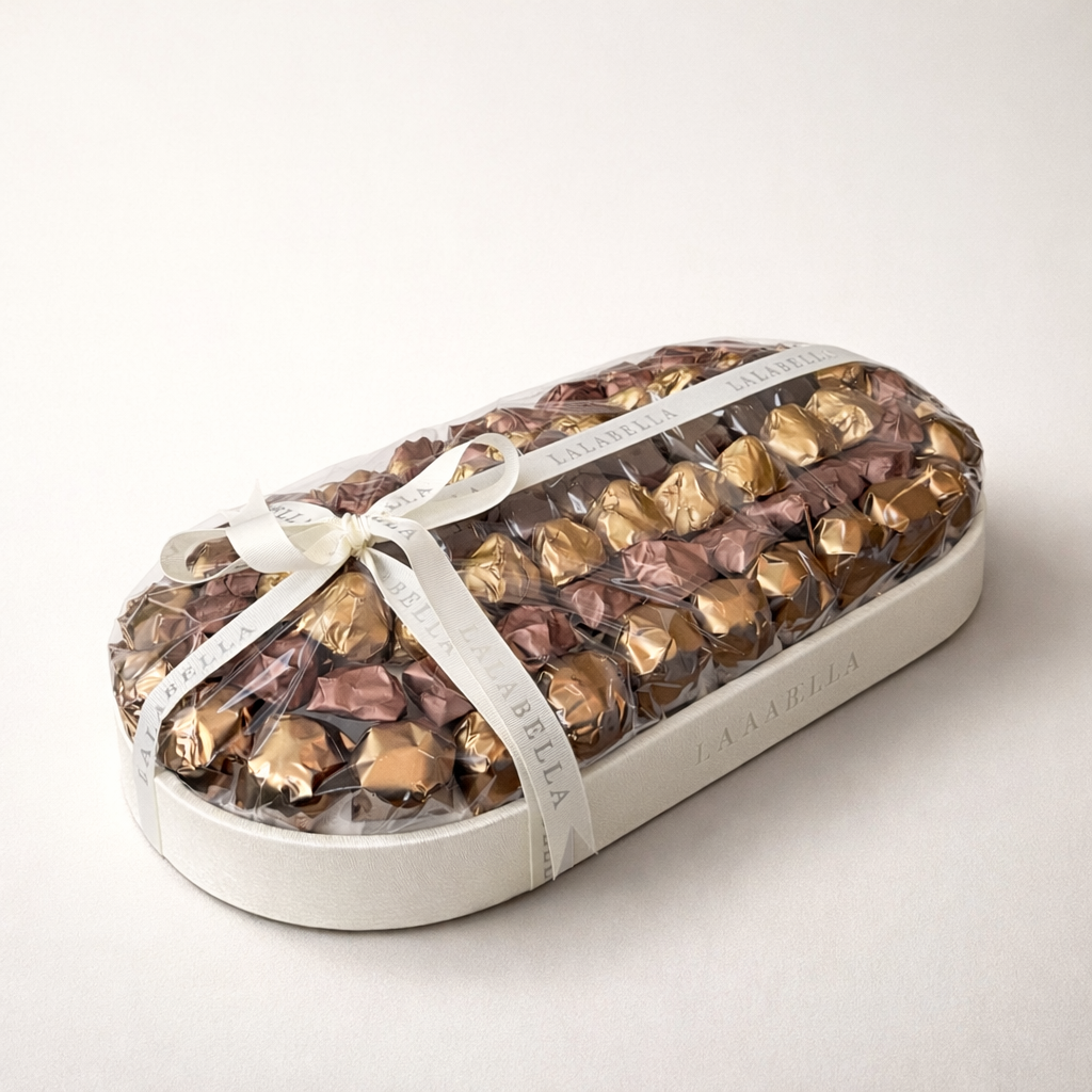 An elegant oval leather tray filled with 1556of premium assortment of chocolates in rich gold, bronze, and brown tones, beautifully wrapped and secured with a transparent cover and a signature ribbon.