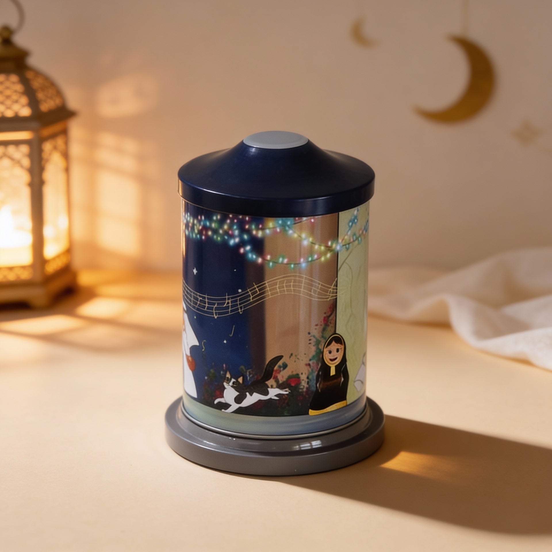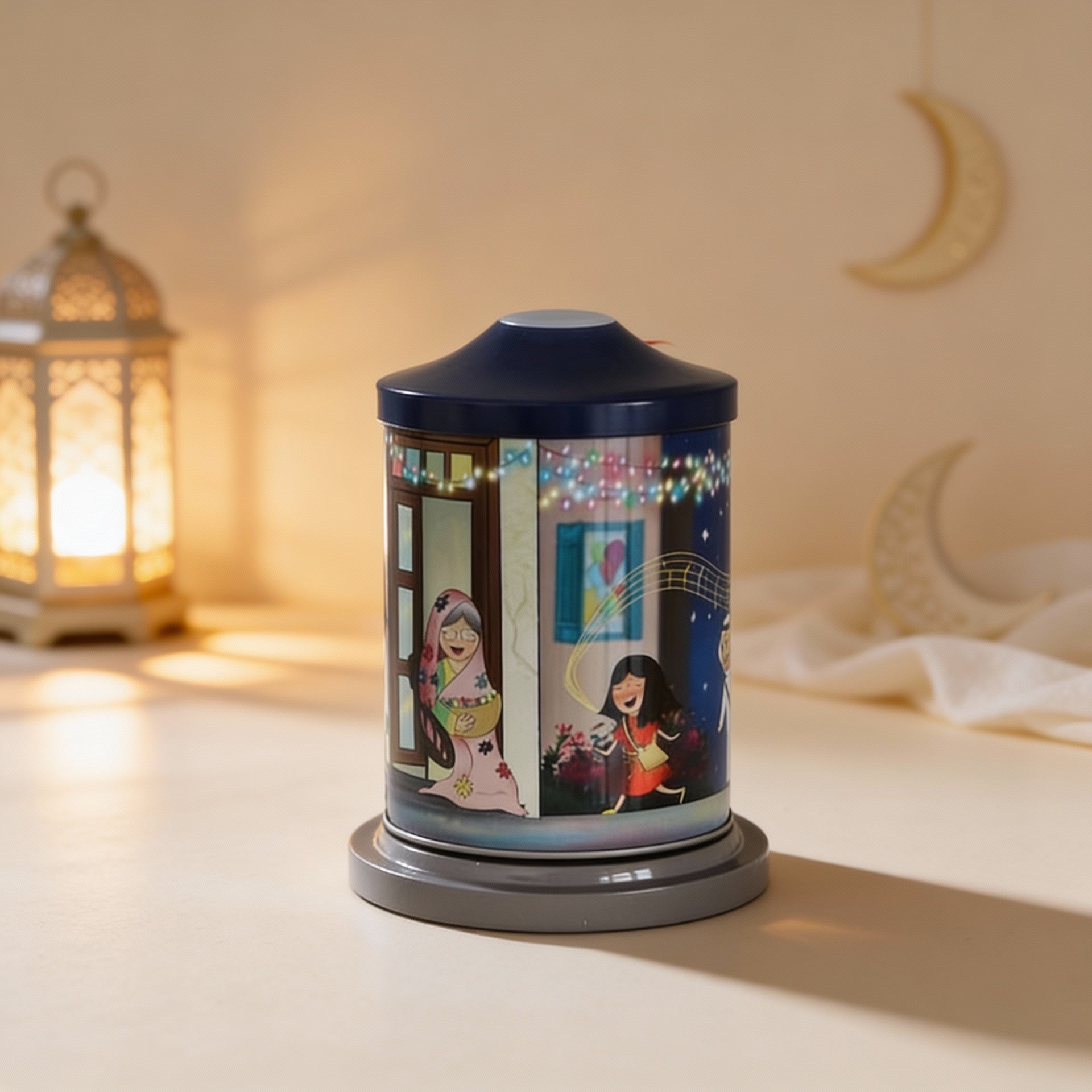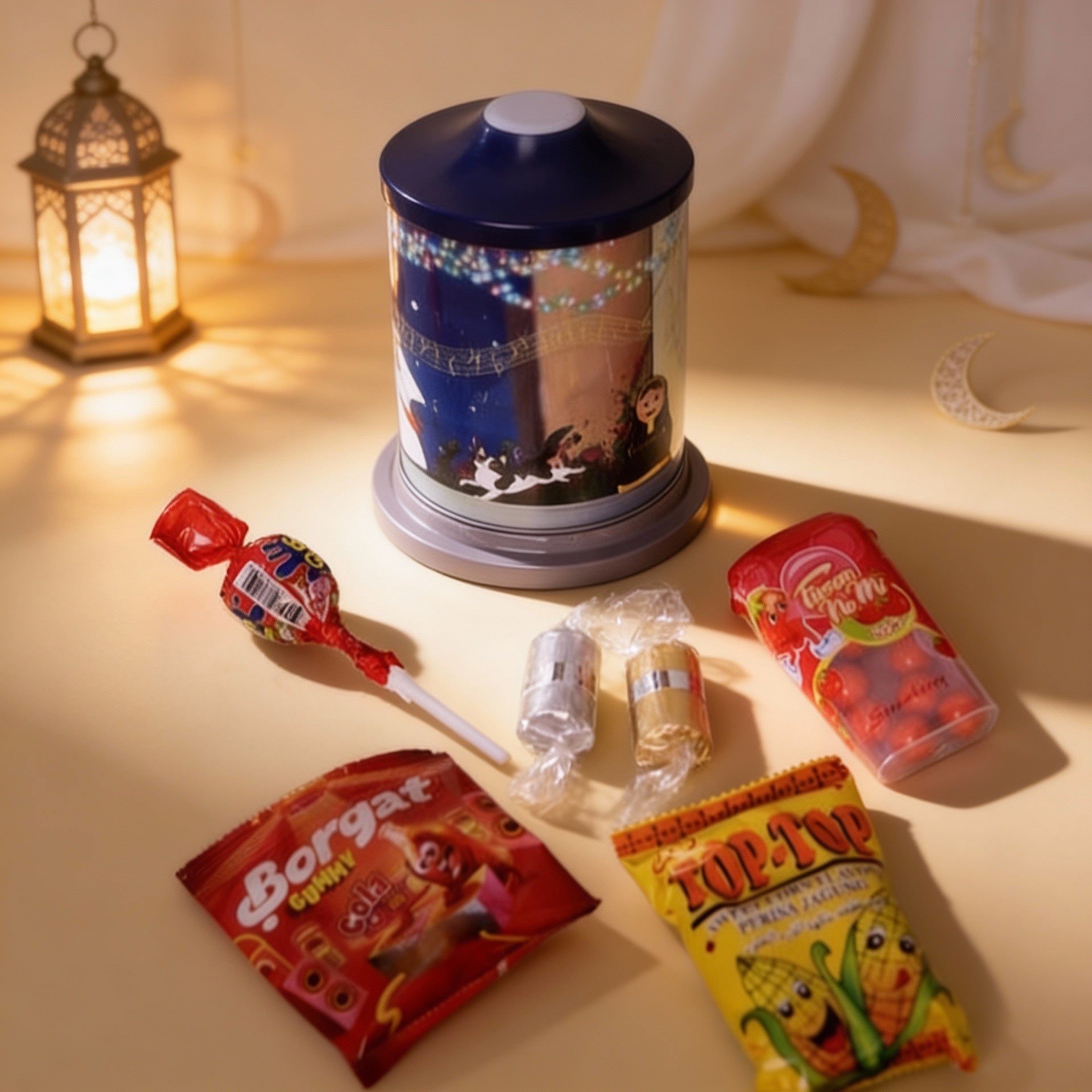 Metal rotating music box playing the traditional gergaon tune with cartoonish kids drawings filled with mixed candies and chocolates.
