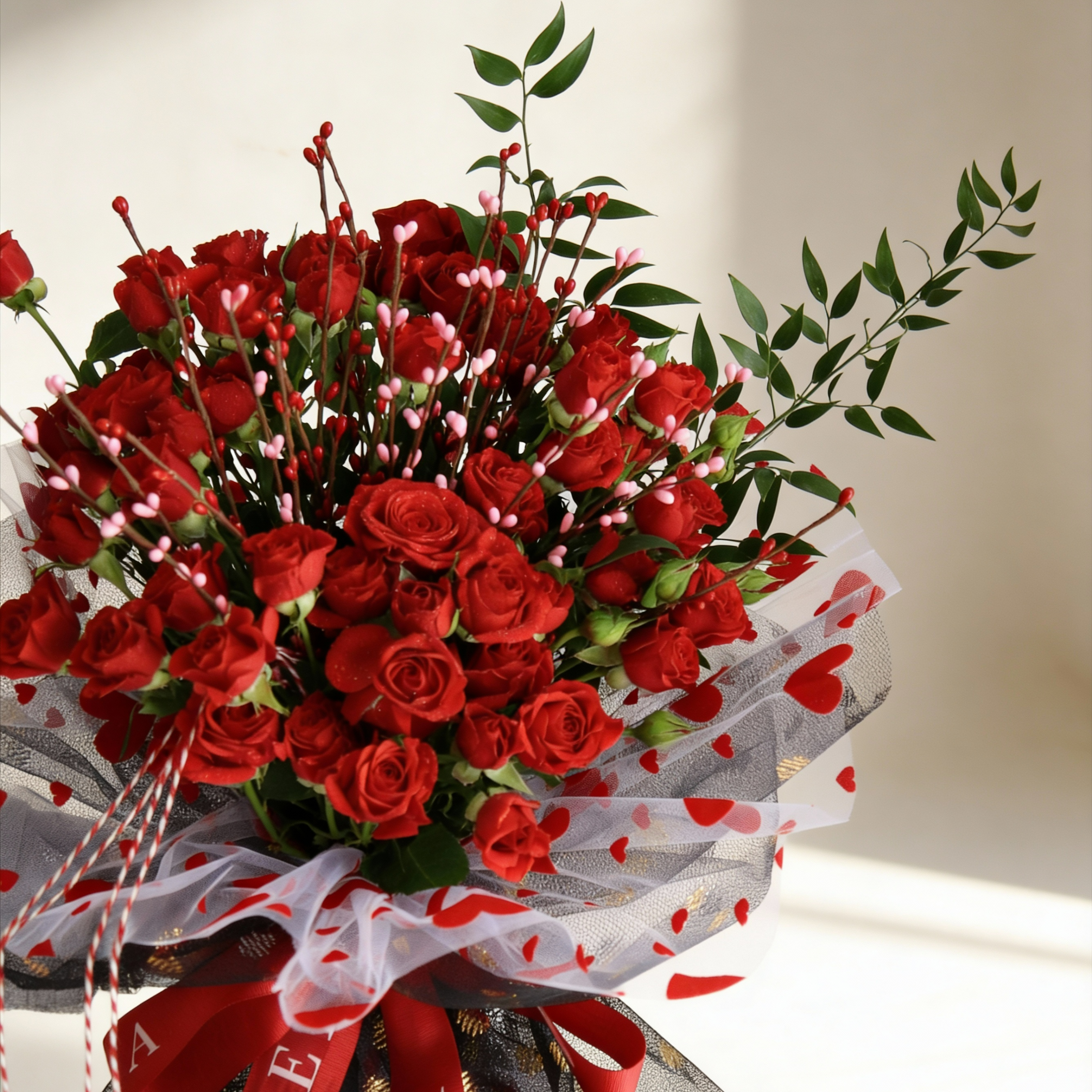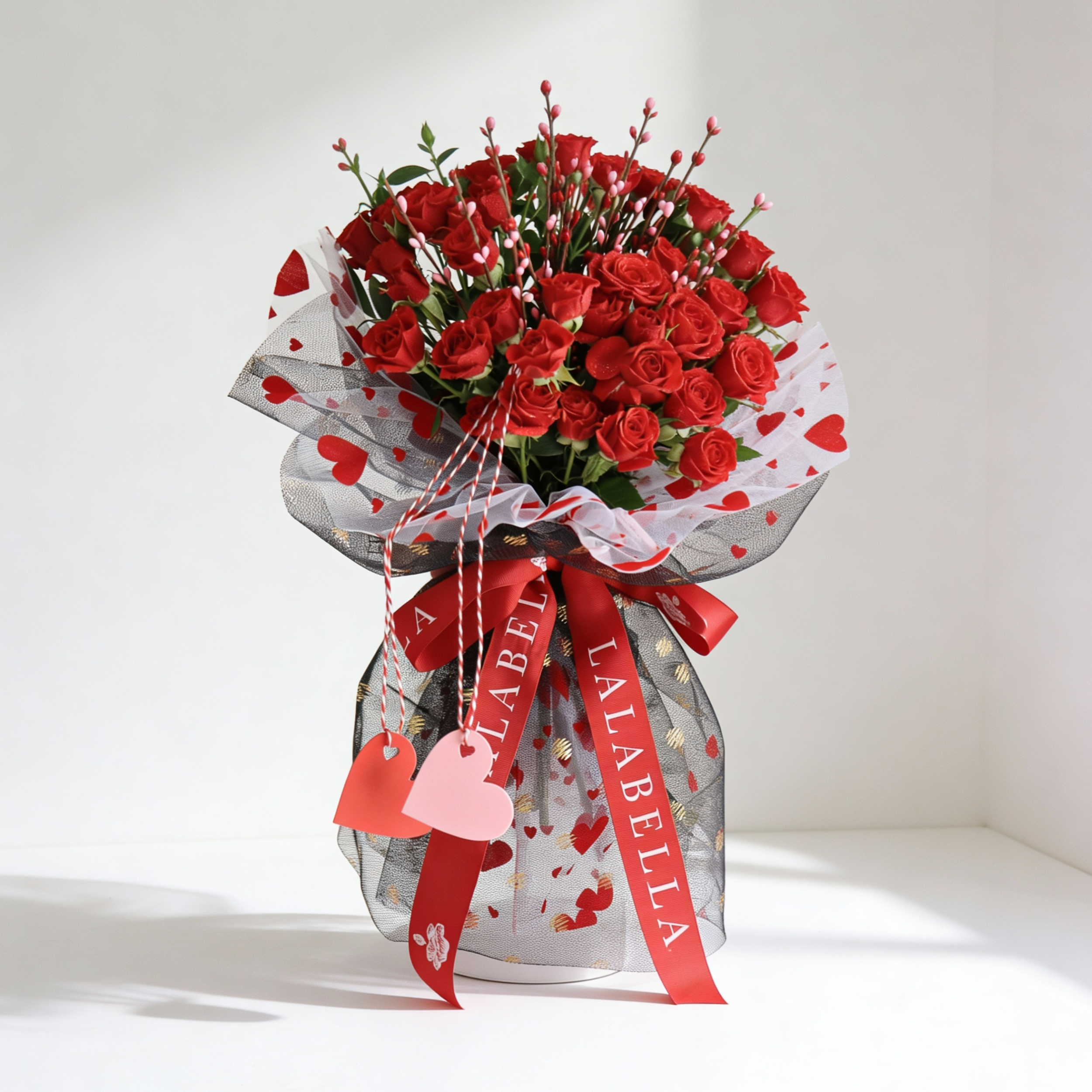 Sweep them off their feet with this stunning Valentines bouquet featuring radiant red roses, beautifully wrapped in elegant double layers of black golden polka dot tulle and romantic hearts tulle. Accented with charming heart sticks, this luxurious arrangement creates a dreamy and unforgettable expression of love.
