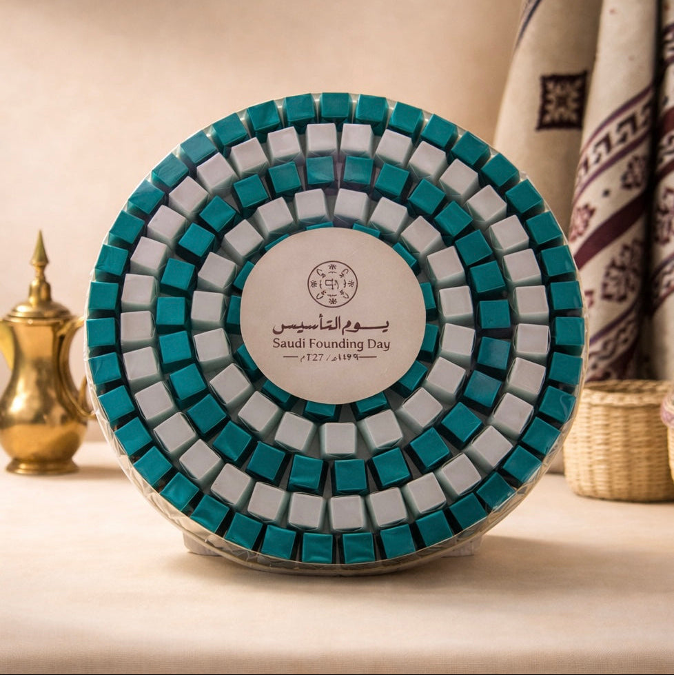 A round tray featuring 128 pieces of MIA chocolate, precisely arranged for a refined and elegant presentation. Decorated with the Saudi Founding Day logo, it is perfect for celebrations and gatherings.