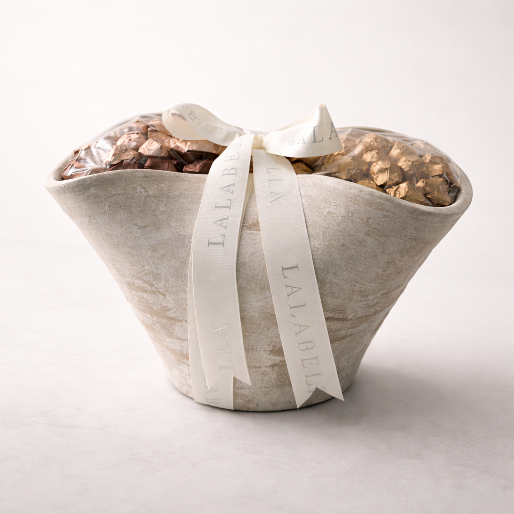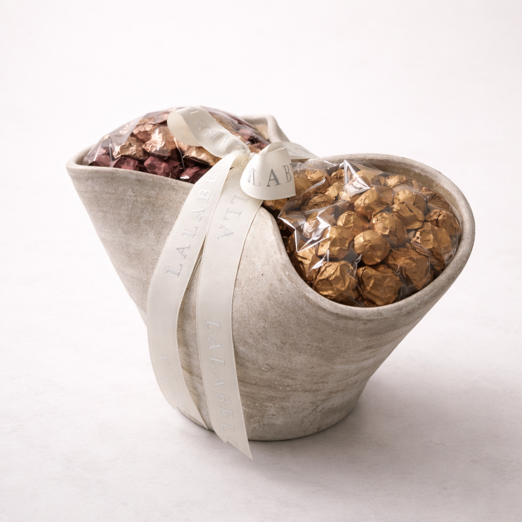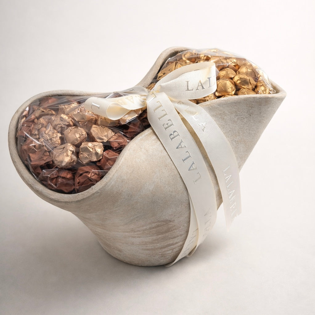 A luxury sculptural bowl in a soft beige stone finish, filled with 650g of mixed chocolates, the Rocher Collection and Deluxe Collection chocolates wrapped in gold and bronze. It is elegantly tied with an ivory ribbon, making it a refined and high-end gift.
