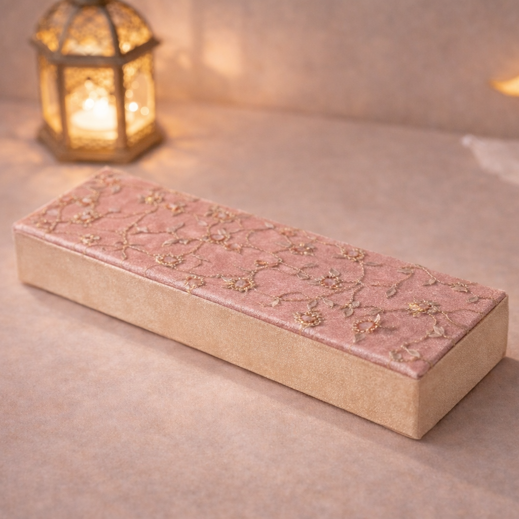 A generous selection of 900g premium Ramadan chocolates beautifully packed in an elegant fabric box with colorful embroidery cover available in 3 colors, perfect for Iftar and gifting.