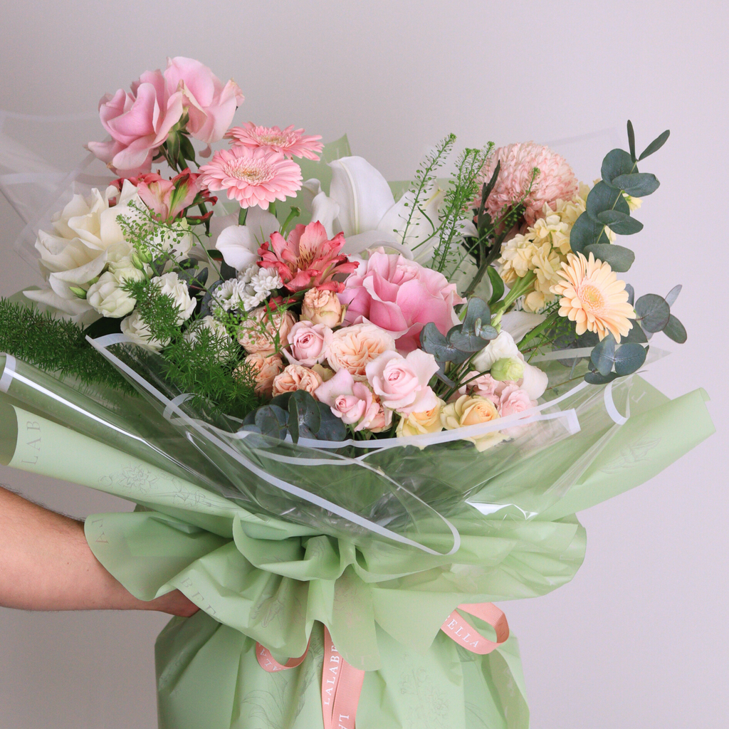 A garden-style bouquet full of character and charm, with roses taking center stage among a lively mix of seasonal blooms. Wrapped in soft mint green and finished with a blush pink ribbon, this airy arrangement is perfect for heartfelt gestures, birthdays, or casual gifting.