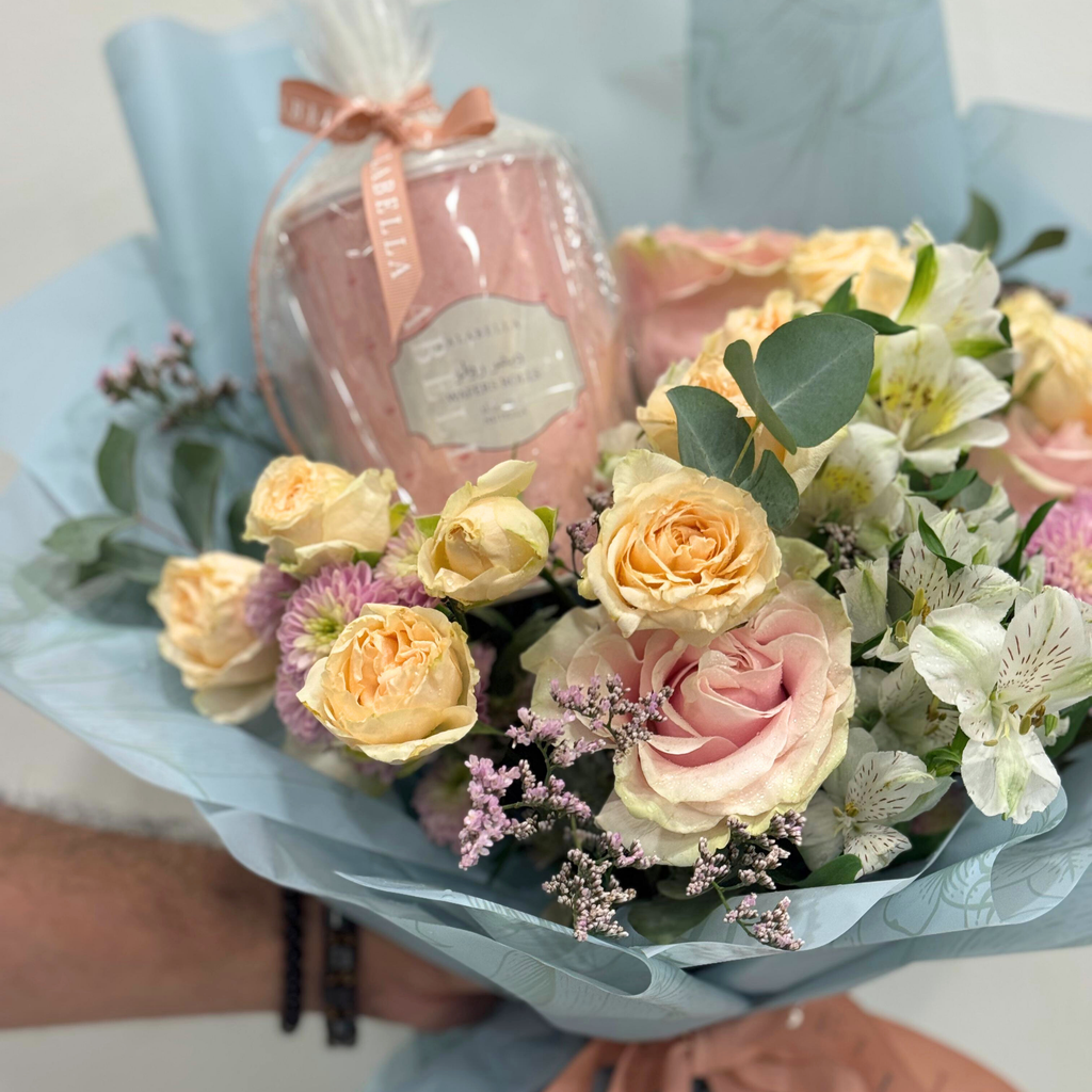 A hand bouquet combining soft pastel blooms with a box of crisp wafer rolls, wrapped in elegant blue paper and tied with a LaBella ribbon. The mix of fresh flowers and sweet treats makes it a thoughtful gift for any occasion, offering both beauty and indulgence in one.