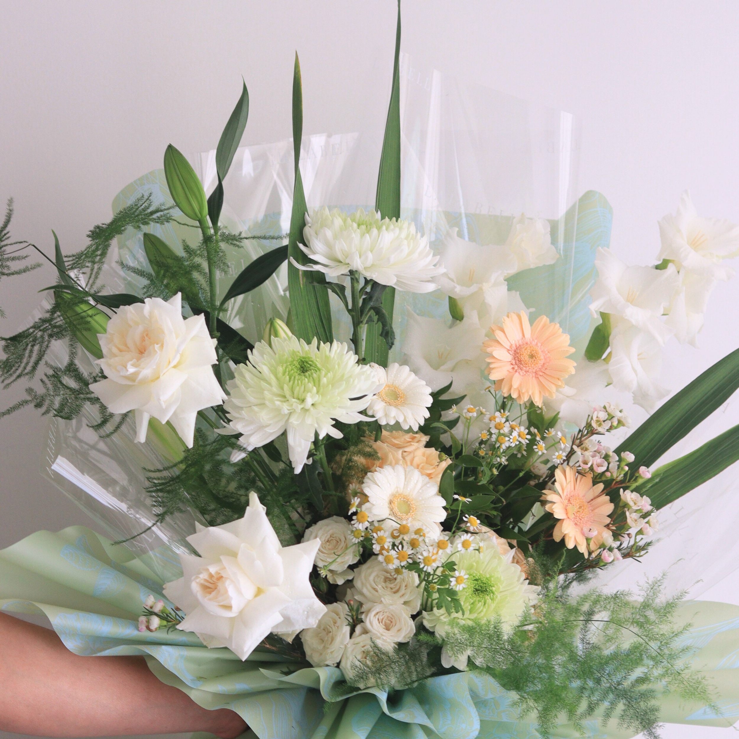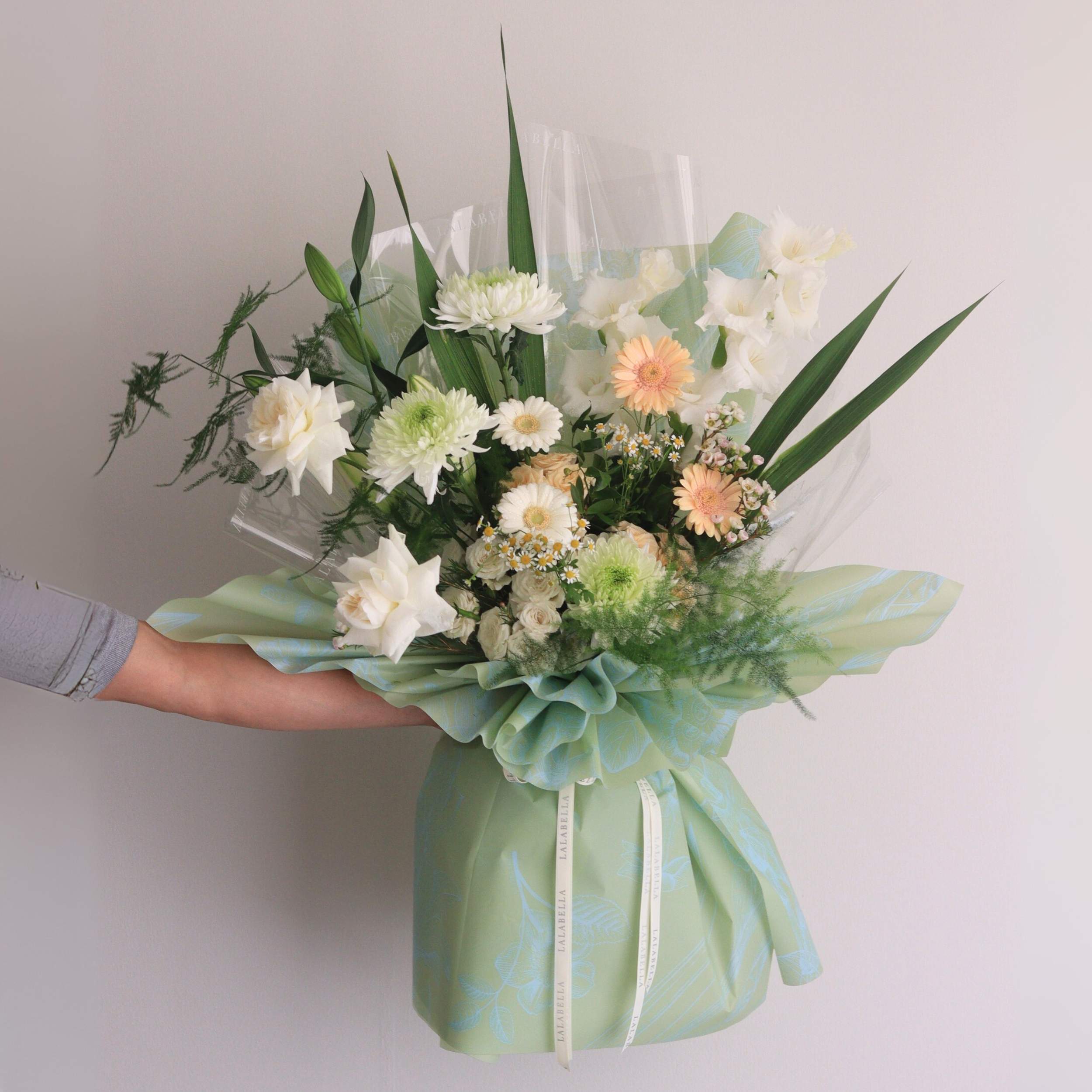 A soft and airy bouquet in refreshing pastel tones, featuring a mix of white, creamy & peach florals accented with fresh greenery. Wrapped in light green floral paper and finished with a cream ribbon, this bouquet is perfect for birthdays, get-well wishes, or simply brightening someone’s day.