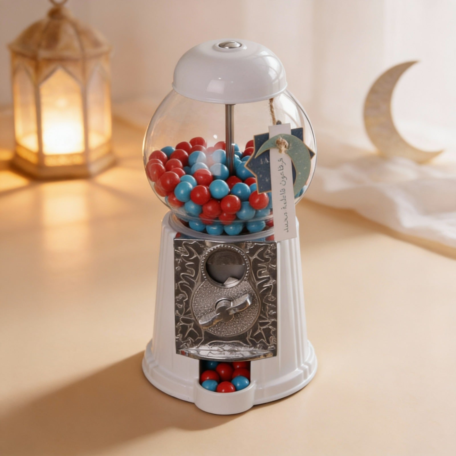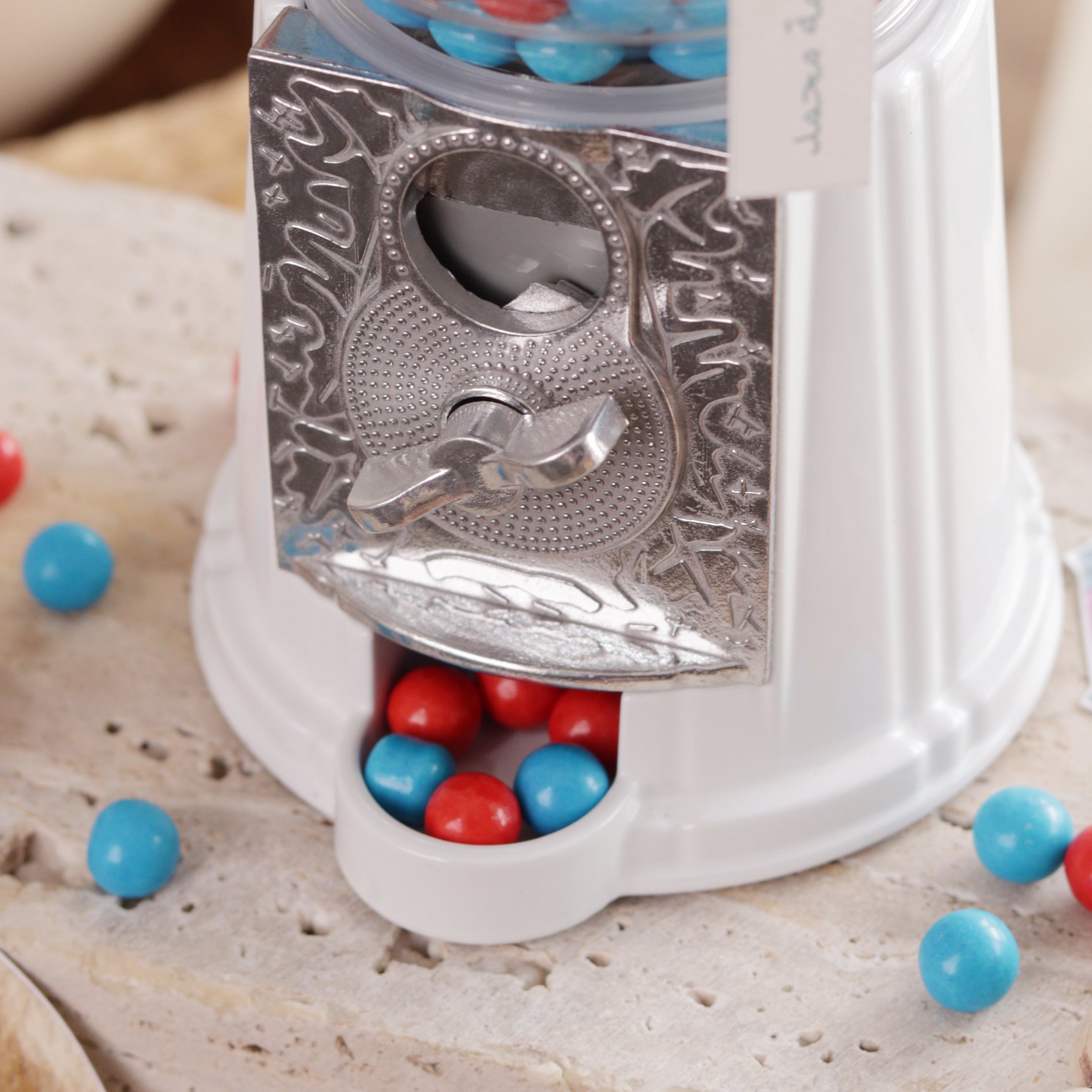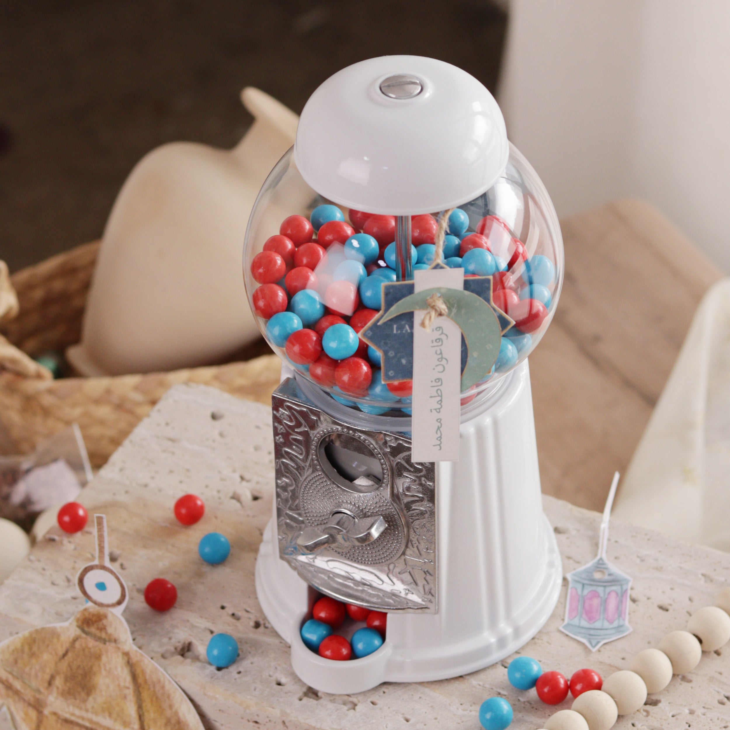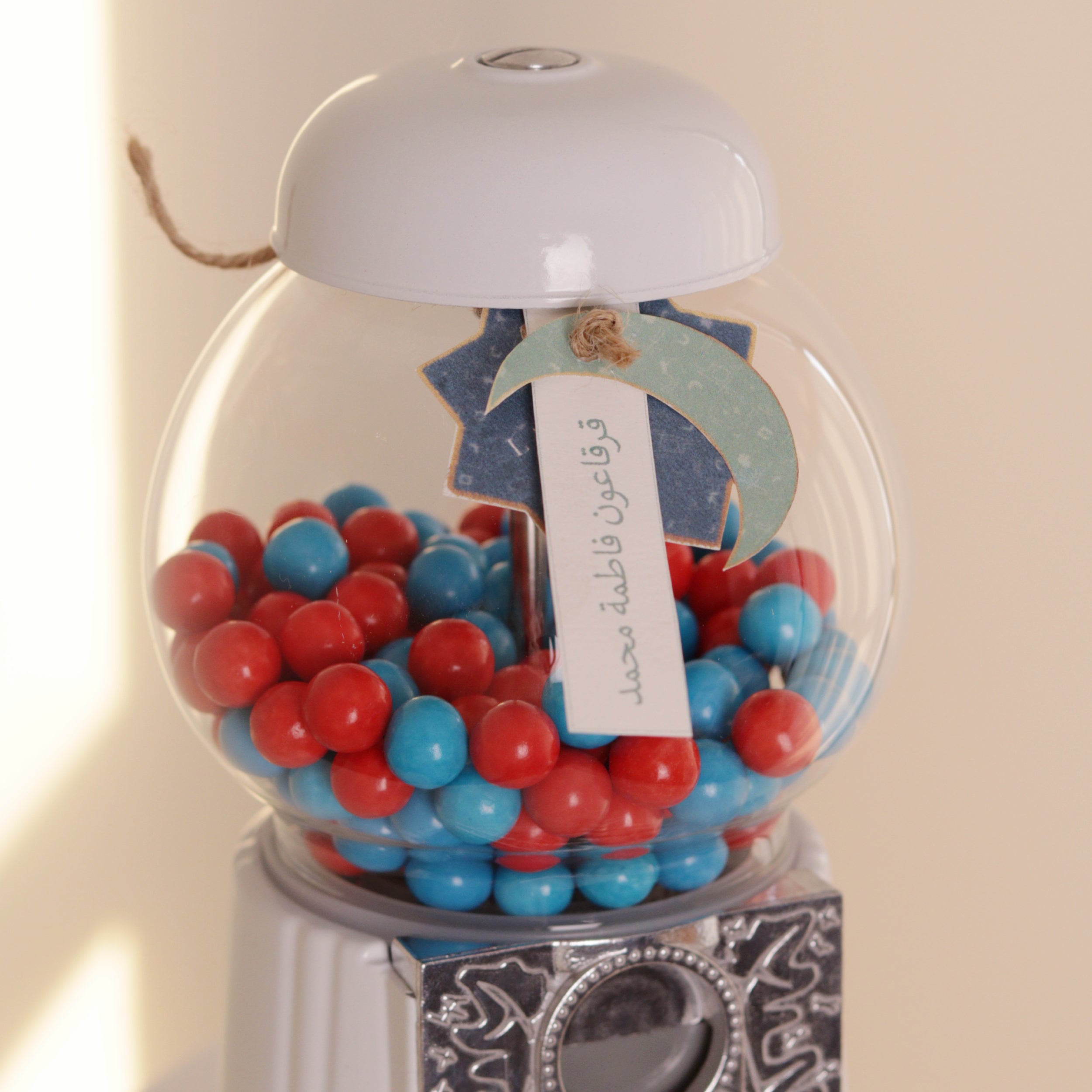 Retro glass gumball dispenser in mini size, filled with red and blue bubble gums with Gergaon Star & Moon tags with kid name. Please provide the kid's name in the notes with a maximum of 2-3 words in total to keep it readable. (Refer to Sample Photo).