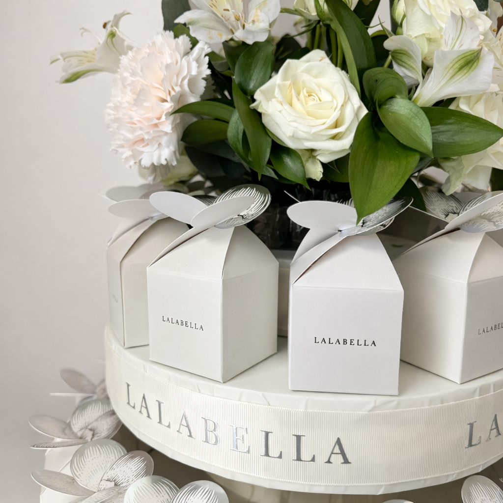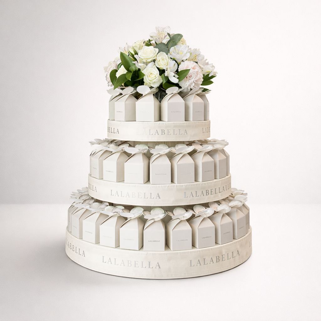 The tower is finished in a soft neutral tone with premium branding bands, and crowned with a delicate floral arrangement that adds a refined, luxurious touch.