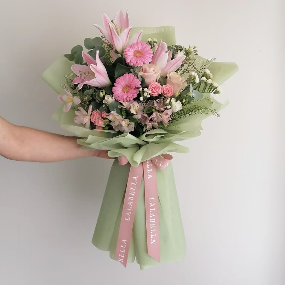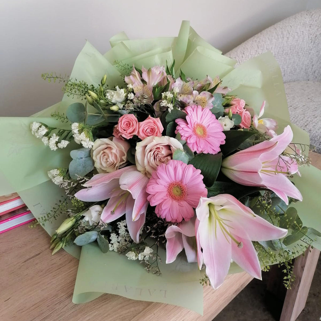 White Lilies, Eucalyptus leaves mixed with seasonal small and medium flowers in a medium hard paper wrapping to send good wishes or celebrate any happy occasion.