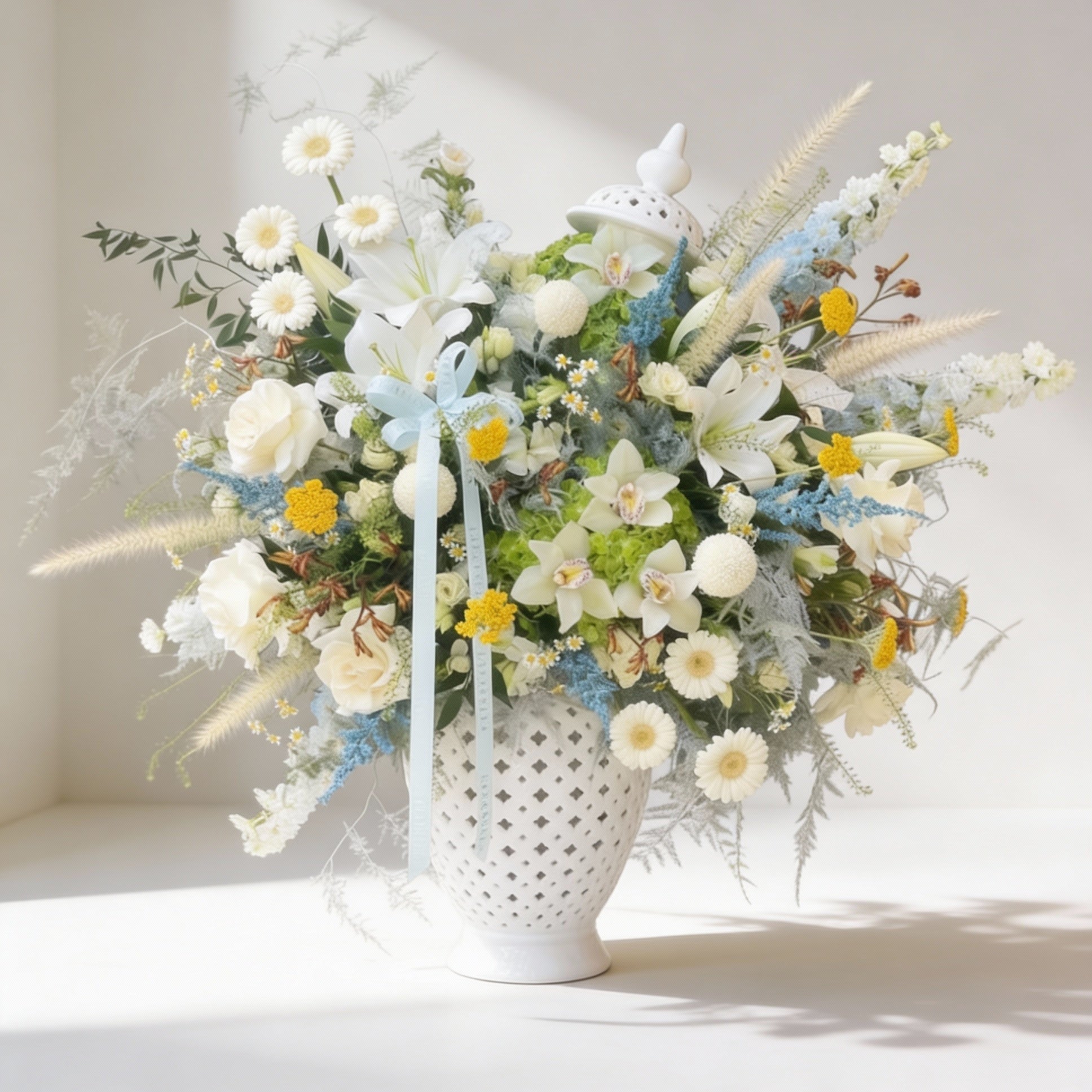 A grand arrangement in white, pale blue, and yellow tones, featuring mixed florals with airy grasses and soft foliage, styled in a big classic white vase. A fresh and uplifting composition with wild garden energy and a breezy, elegant flow.