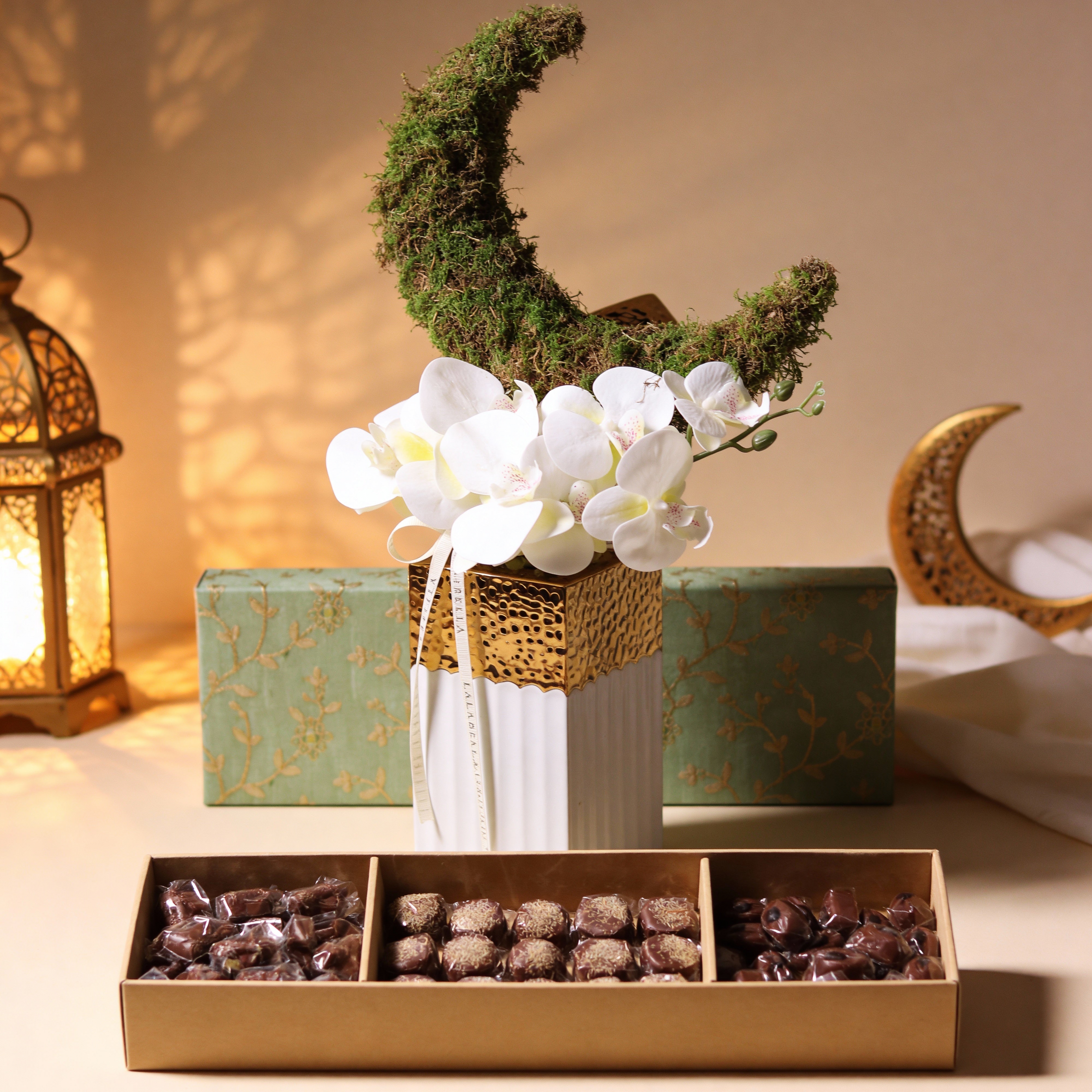 A generous selection of 900g premium Ramadan chocolates beautifully packed in an elegant fabric box with colorful embroidery cover available in 3 colors, perfect for Iftar and gifting.