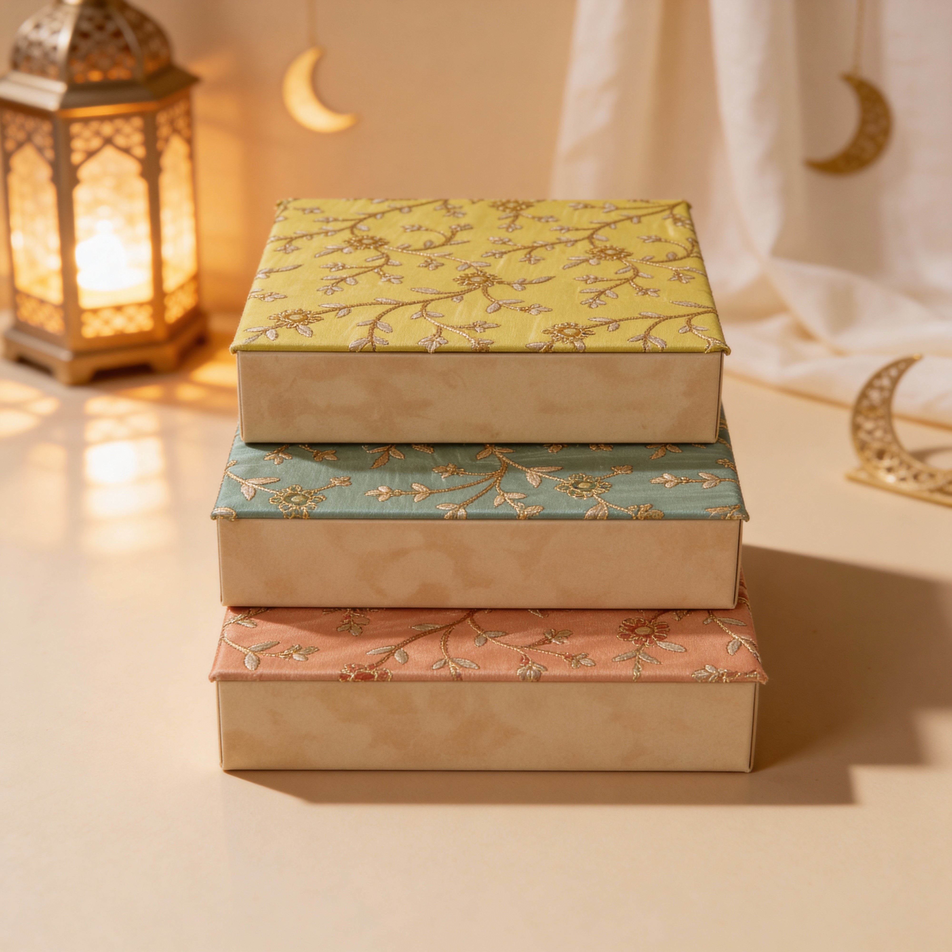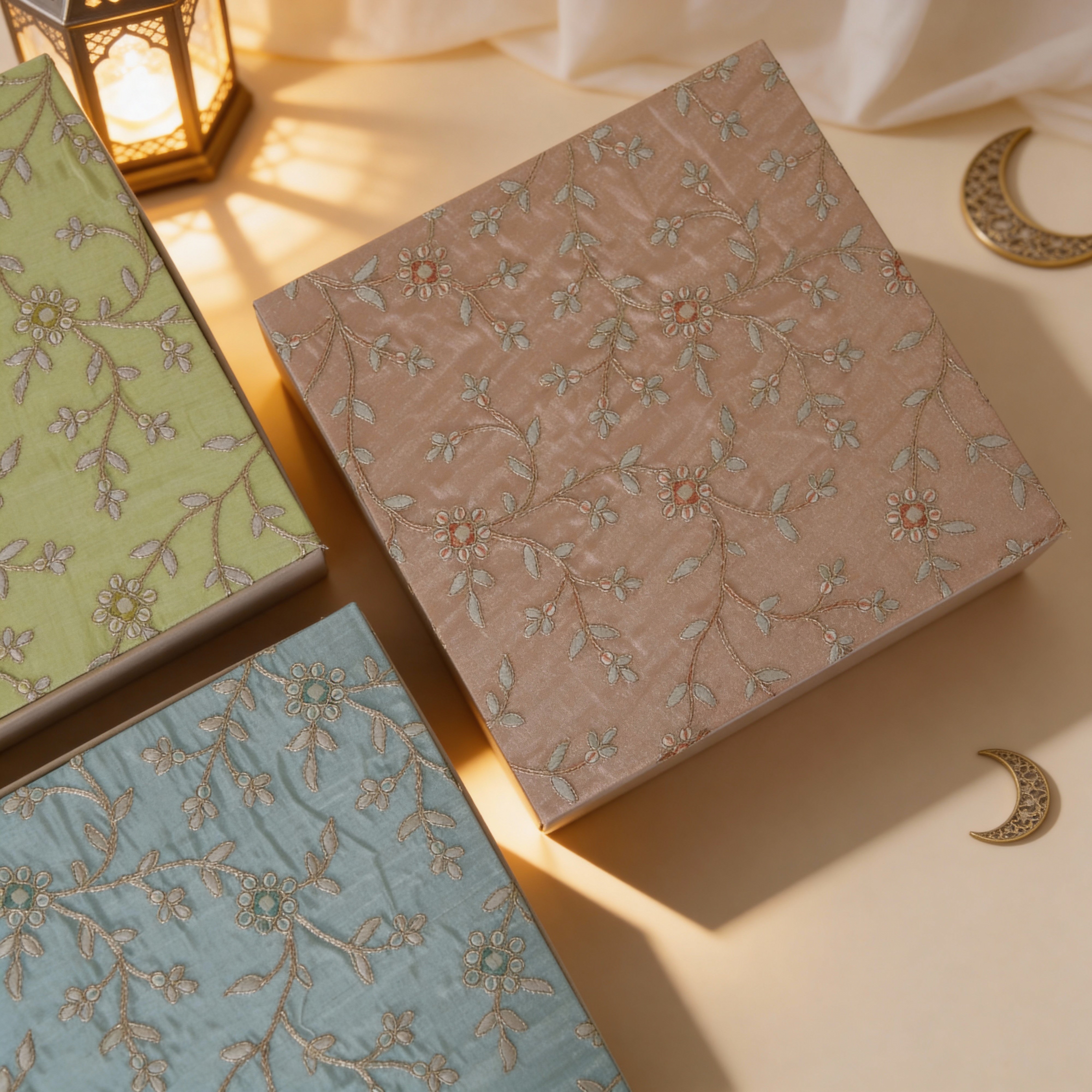 A Square velvet box with colorful embroidey cover filled with 1 kg Includes Kunafa Flakes, round almond croquant, Mia chocolates, and crunchy sticks, beautifully packed for Iftar and gifting.