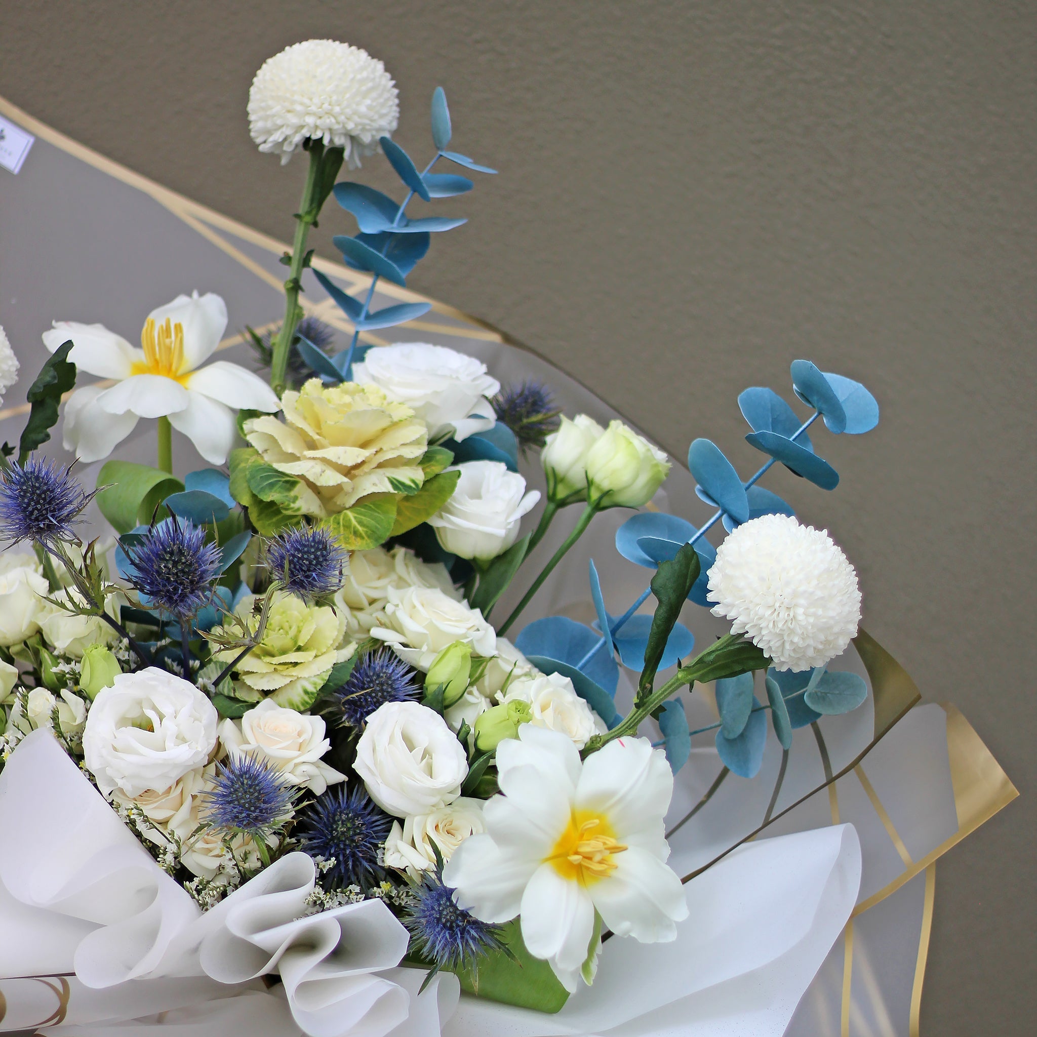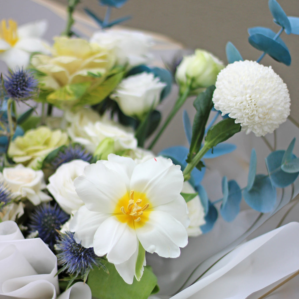 Celebrate new beginnings and chapters in life with this bouquet of blooming tulips, eucalyptus leaves and other seasonal flowers in sheer and gold wrapping.